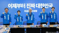 [서울=뉴스핌] 윤창빈 기자 = 김부겸(왼쪽부터)·강금실·윤여준·박찬대·김경수 더불어민주당 총괄선거대책위원장이 7일 오전 서울- 2025.05.07 10:27
