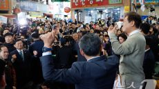 (영동=뉴스1) 안은나 기자 = 이재명 더불어민주당 대통령 후보가 골목골목 경청투어 이틀차인 6일 오후 충북 영동군 영동중앙시- 2025.05.06 16:37