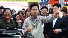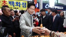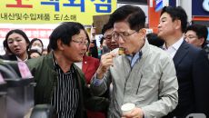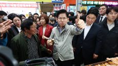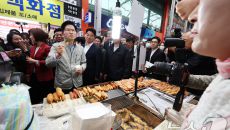죽도시장 도착해 꽃다발 받는 김문수 후보