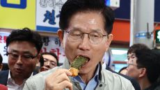 (포항=뉴스1) 김민지 기자 = 김문수 국민의힘 대통령 후보가 6일 경북 포항시 죽도시장에서 구매한 어묵을 먹고 있다. 202- 2025.05.06 14:28