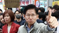 (포항=뉴스1) 김민지 기자 = 김문수 국민의힘 대통령 후보가 6일 경북 포항시 죽도시장에서 구매한 어묵을 먹으며 엄지를 치켜- 2025.05.06 14:38