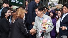 죽도시장 도착해 꽃다발 받는 김문수 후보