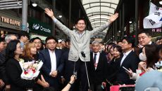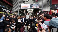 (포항=뉴스1) 김민지 기자 = 김문수 국민의힘 대통령 후보가 6일 경북 포항시 죽도시장에서 시민들과 인사하며 손하트를 그리고- 2025.05.06 14:11