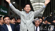 (포항=뉴스1) 김민지 기자 = 김문수 국민의힘 대통령 후보가 6일 경북 포항시 죽도시장을 찾아 시민들을 향해 인사하고 있다.- 2025.05.06 14:10
