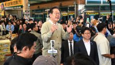 (포항=뉴스1) 김민지 기자 = 김문수 국민의힘 대통령 후보가 6일 경북 포항시 죽도시장을 찾아 시민들을 향해 인사하고 있다.- 2025.05.06 14:11