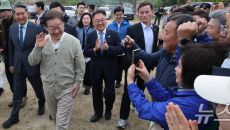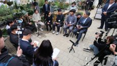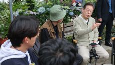 (보은=뉴스1) 안은나 기자 = 이재명 더불어민주당 대통령 후보가 '골목골목 경청투어'에 나선 6일 충북 보은군 화훼농원 숲결- 2025.05.06 13:06