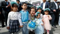 이재명 후보 '파란 꽃머리띠 쓴 어린이들과 함께'