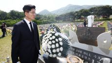 제2연평해전·연평도 포격전 전사자 묘비 어루만지는 김문수 후보