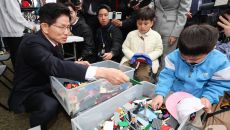 어린이들과 블럭 모자 만드는 김문수 후보