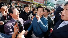 이재명 더불어민주당 대선 후보가 4일 경북 영주시와 예천군, 충북 단양군, 강원 영월군을 잇따라 방문하며 시장 상인 등과 만나- 2025.05.04 18:06