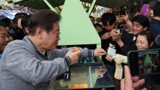 [서울=뉴시스]정금민 기자 = 이재명 더불어민주당 대선 후보가 지역화폐 발행 규모를 늘려 골목 상권을 키우고 비상계엄으로 피해- 2025.05.04 10:27