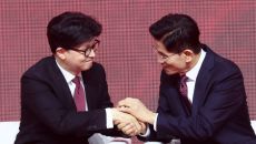 경선결과 발표 후 한동훈 후보 손 잡는 김문수 후보