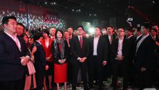 당 지도부와 두 팔 번쩍 든 김문수 대통령 후보