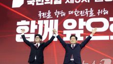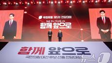 국민의힘 대선 후보로 선출된 김문수 후보가 3일 경기 고양시 킨텍스에서 열린 국민의힘 전당대회에서 한동훈 후보를 포함한 참석자- 2025.05.03 16:33