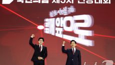 (고양=뉴스1) 김민지 기자 = 김문수(오른쪽), 한동훈 국민의힘 대선 경선 후보가 3일 오후 경기 고양시 킨텍스에서 열린 제- 2025.05.03 16:33