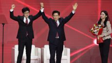 김문수 국민의힘 대통령 후보가 3일 경기 고양시 킨텍스에서 열린 5차 전당대회에서 최종 후보로 확정된 뒤 두 손을 번쩍 들고- 2025.05.03 15:57