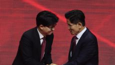 김문수 국민의힘 대통령 후보가 3일 경기 고양시 킨텍스에서 열린 5차 전당대회에서 최종 후보로 확정된 뒤 한동훈 후보와 악수하- 2025.05.03 15:58