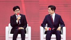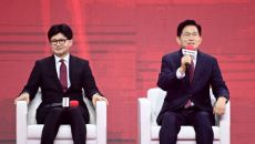 한동훈(왼쪽), 김문수 국민의힘 대선 경선 후보가 3일 경기 고양시 킨텍스에서 열린 5차 전당대회에서 토크 콘서트를 하고 있다- 2025.05.03 15:26