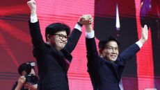 함께 단상 내려오는 김문수·한동훈