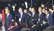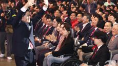 (고양=뉴스1) 이광호 기자 = 김문수 국민의힘 대선 경선 후보가 3일 경기 고양시 킨텍스에서 열린 5차 전당대회에 입장하고- 2025.05.03 14:47