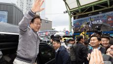 시민들 향해 손 들어올려 인사하는 이재명