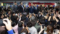 거진전통시장 찾아 인사하는 이재명