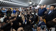 고성 시민들에게 인사하는 이재명
