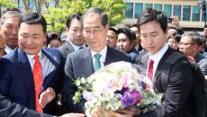 [포토]꽃다발 받는 한덕수 전 국무총리