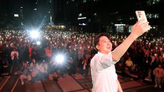 (서울=뉴스1) 박정호 기자 = 12일 오후 서울 중구 청계광장에서 열린 이준석 개혁신당 대선후보의 집중유세에서 시민들이 이- 2025.05.12 20:53