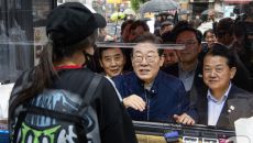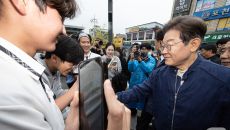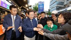 (포천=뉴스1) 이재명 기자 = 이재명 더불어민주당 대통령 후보가 1일 오후 경기도 포천시 신읍사거리 일대를 찾아 시민들과 인- 2025.05.01 18:14