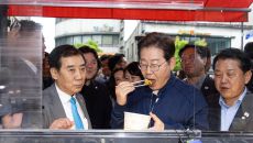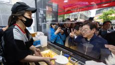(서울=뉴스1) 이재명 기자 = 이재명 더불어민주당 대통령 후보가 1일 오후 경기도 포천시 신읍사거리 일대를 찾아 닭강정을 맛- 2025.05.01 18:12