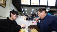 (포천=뉴스1) 이재명 기자 = 이재명 더불어민주당 대통령 후보가 1일 오후 경기도 포천시 신읍사거리 인근에 위치한 토스트 가- 2025.05.01 18:15
