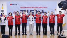 (서울=뉴스1) 이광호 기자 = 김문수 국민의힘 대통령 후보와 공동선대위원장들이 12일 오전 서울 영등포구 여의도 중앙당사에서- 2025.05.12 11:57