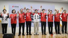 아시아투데이 이병화 기자 = 김문수 국민의힘 대선 후보와 권성동 공동선거대책위원장을 비롯한 중앙선대위 위원장들이 12일 오전- 2025.05.12 11:50