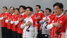(서울=뉴스1) 이광호 기자 = 김문수 국민의힘 대통령 후보와 권성동 원내대표를 비롯한 공동선대위원장들이 12일 오전 서울 여- 2025.05.12 10:49