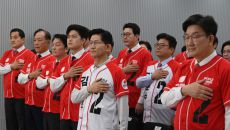 (서울=뉴스1) 이광호 기자 = 김문수 국민의힘 대통령 후보와 권성동 원내대표를 비롯한 공동선대위원장들이 12일 오전 서울 여- 2025.05.12 10:46