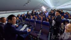 공군 1호기에서 순방 기자간담회 갖는 이재명 대통령