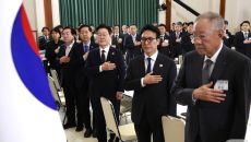 (서울=뉴스1) 허경 기자 = 이재명 대통령이 9일 청와대에서 열린 경제성장전략 국민보고회에서 참석자들과 국민의례를 하고 있다- 2026.01.09 14:19