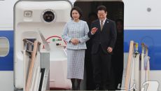 (성남=뉴스1) 이광호 기자 = 이재명 대통령과 김혜경 여사가 17일 오전 주요 20개국(G20) 정상회의 참석을 계기로 아프- 2025.11.17 09:27