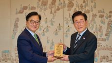 우원식 국회의장에게 '기억패' 선물 받는 이재명 대통령