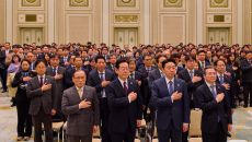 (서울=뉴스1) 이재명 기자 = 이재명 대통령이 2일 청와대 영빈관에서 열린 시무식에서 국민의례를 하고 있다. (청와대 제공.- 2026.01.02 19:57