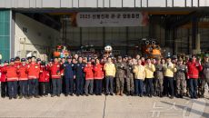 산불진화 관·군 합동훈련 참석자들과 기념촬영 하는 이재명 대통령