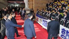 [포토] 국회 도착한 이재명 대통령, 시위하는 국민의힘 향해 인사