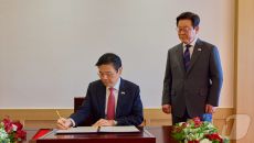 싱가포르 총리 방명록 작성 지켜보는 이재명 대통령