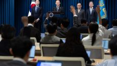 특별성명 발표 후 취재진 질문 답변하는 이재명 대통령