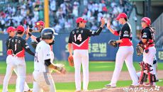 20일 잠실구장에서 열린 두산 베어스와 KIA 타이거즈의 경기. 승리한 KIA 선수들이 기뻐하고 있다. 잠실=박재만 기자 pj- 2025-04-20 17:56