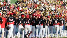 20일 잠실구장에서 열린 두산 베어스와 KIA 타이거즈의 경기. 승리한 KIA 선수들이 기뻐하고 있다. 잠실=박재만 기자 pj- 2025-04-20 17:57