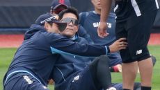 (서울=연합뉴스) 하남직 기자 = 수비 중 동료와 부딪혀 왼쪽 무릎을 다친 홍창기(LG 트윈스)가 "큰 부상을 피해 마음이 편- 2025-05-15 12:55