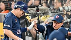 이승엽 감독 '양의지 홈런에 감탄'[포토]