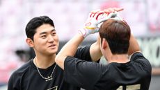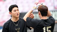 15일 광주KIA챔피언스필드에서 열린 롯데와 KIA의 경기, 타격훈련을 하던 김도영과 박정우가 이야기를 나누고 있다. 광주=허- 2025-05-15 15:49